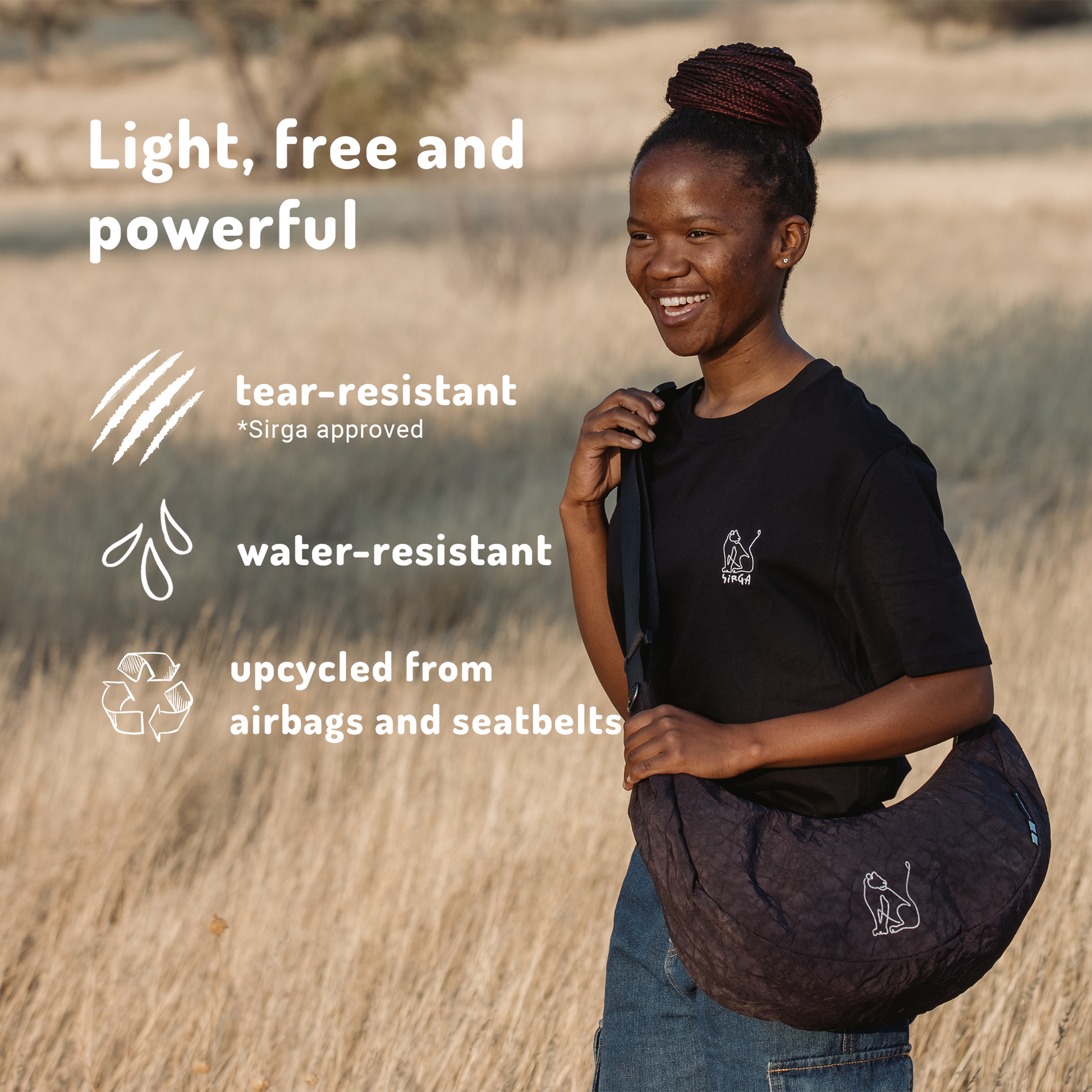 Moonbag upcycled from extremely durable, high-quality airbags & seatbelts. Sustainable & made to last.